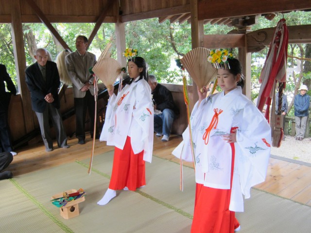 昔から、地区の小学生の女の子が、浦安の舞いを奉納することになっています。