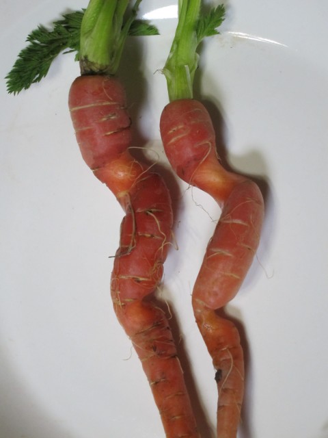 ちゃんと、間引きして、1本づつを、きれいに太らすと、こんな愛し合う人参はできないでしょうね。