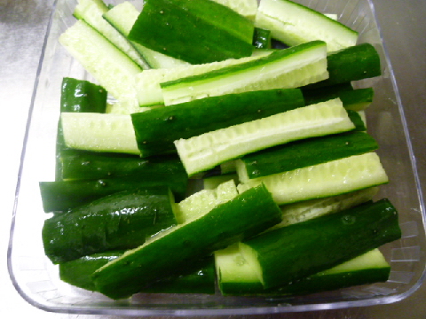 1.きゅうりは3〜4センチの、スティック状に切ったら、