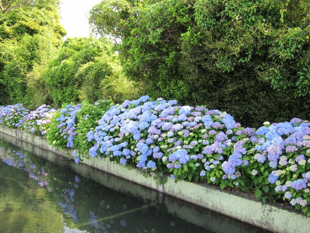 水路に映った、紫やピンクの紫陽花が、